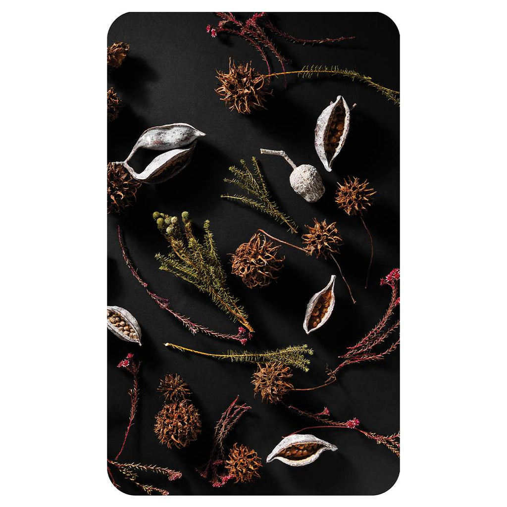 DRIED PODS, SPRIGS, AND SEEDS ON BLACK KITCHEN TOWEL