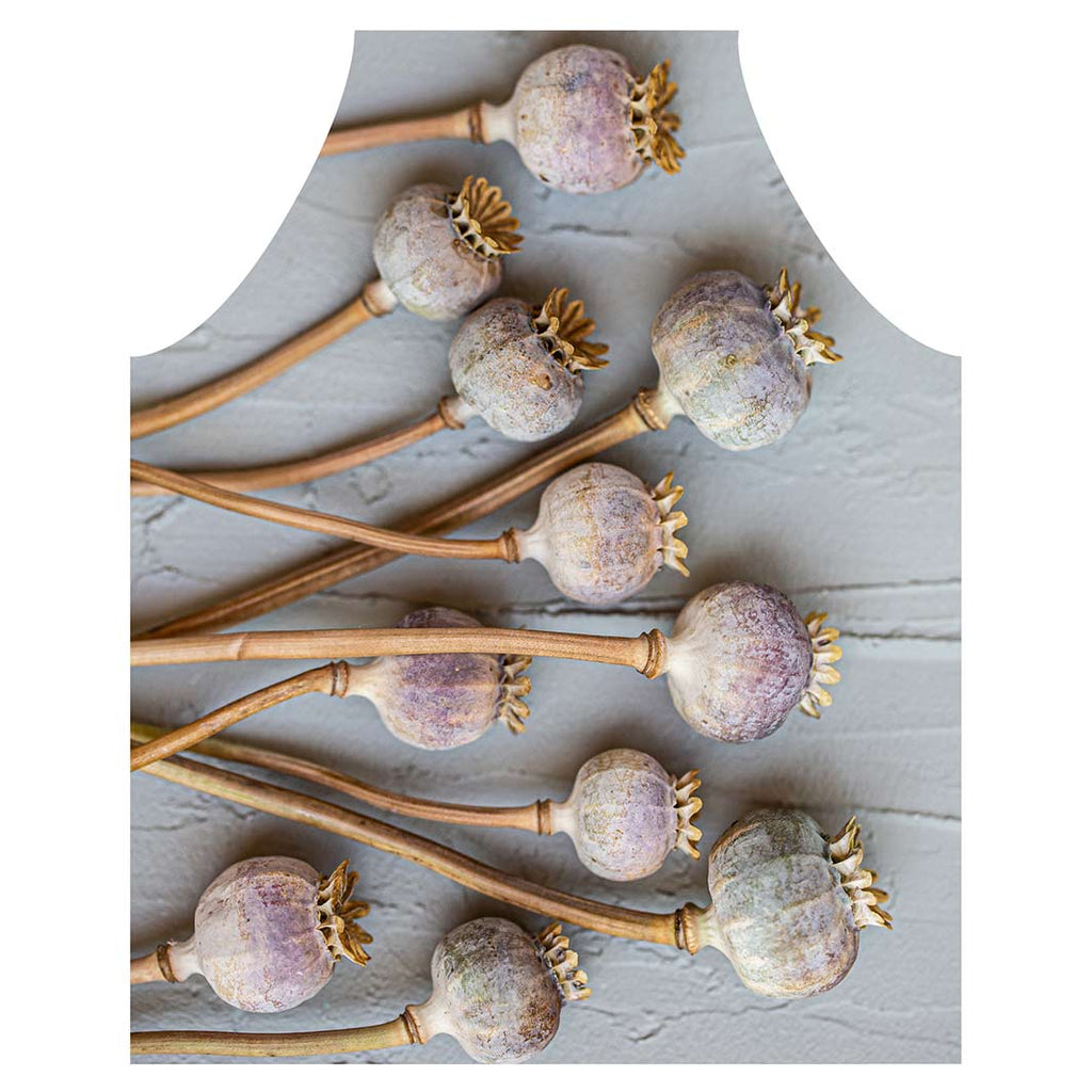 NATURAL PURPLE GIANT POPPY SEEDS ON GREY APRON